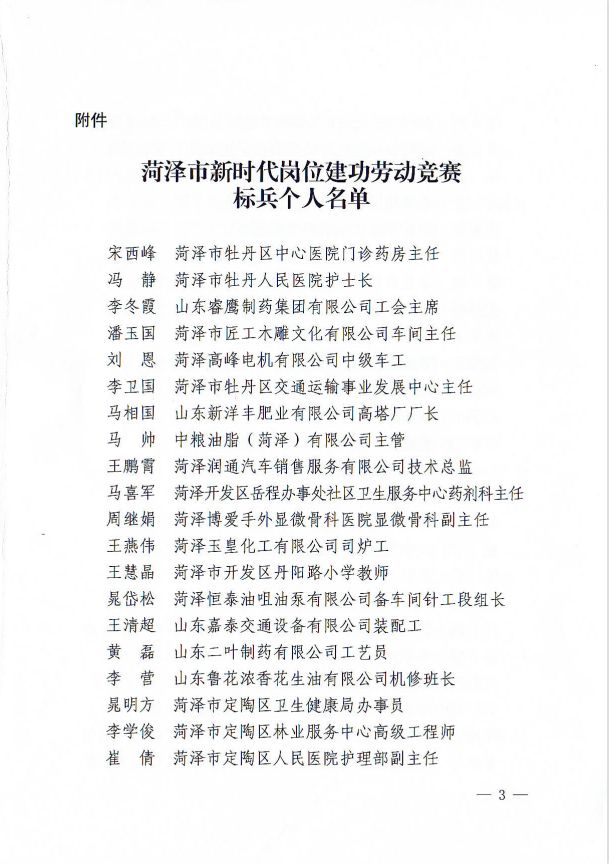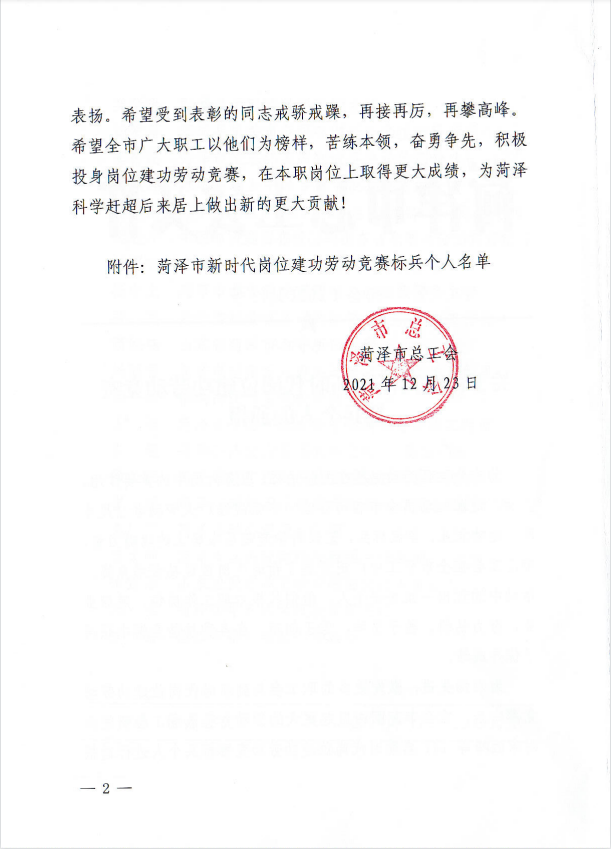 我司員工榮獲菏澤市新時代崗位建功勞動競賽標兵個人 2022-1-19 本文被閱讀 1938 次
